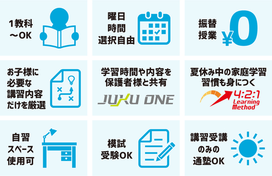 one塾ではノート・教科書・辞書の使い方、間違った問題の解きなおしの方法など、勉強の仕方の指導に力を入れております。また、one塾オリジナルの4:2:1学習法とJUKU ONEも使いながら、塾だけでなくご家庭でもお子様が1人でも勉強を進められるよう指導しています。