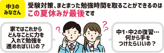 多くの部活動において、夏の大会が引退試合となります。これまで部活動に力を注いでいたお子様も、自分の進路に向き合い勉強し始める時期です。受験を終えた中学3年生の約9割が「春から夏に受験勉強を始めておけばよかった」、「進路についてもっと考えておけばよかった」と口にします。