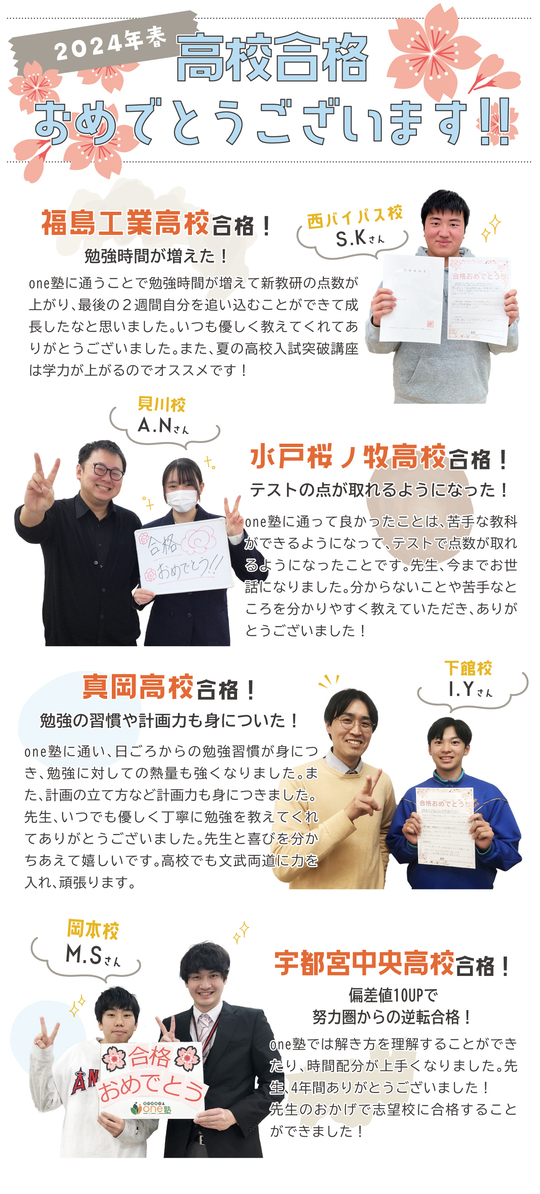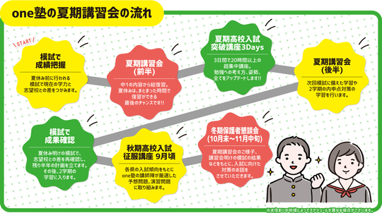 秋、冬から本格的に受験勉強をスタートした場合、目標偏差値に到達できる可能性は極めて低くなります。まずはone塾の夏期講習で中1・中2の苦手単元克服に取り組んでいきましょう!