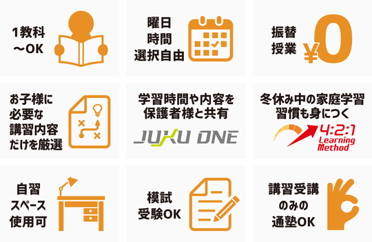 one塾ではノート・教科書・辞書の使い方、間違った問題の解きなおしの方法など、勉強の仕方の指導に力を入れております。また、one塾オリジナルの4:2:1学習法とJUKU ONEも使いながら、塾だけでなくご家庭でもお子様が1人でも勉強を進められるよう指導しています。