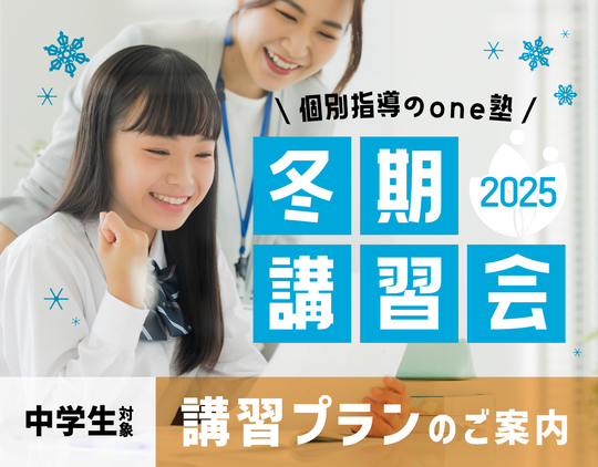 冬期講習会では、通常よりたくさん塾に来ていただき、よりたくさんの演習と、より細かく具体的なアドバイスをいたします! どんなに準備をしても心配や不安はついて回るのが自然なことです。それを和らげる方法は、いまやっていることを信じて、 一歩一歩着実に前に進んでいくことです。 one塾講師陣一同、お子様の心配事が解消されるよう尽力いたしますので、最後の頑張り時を一緒に乗り越えましょう!