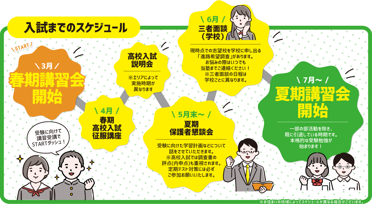 各県の高校入試の入試制度の仕組みや出題傾向などについて、資料のご提供とともにご説明をさせていただきます。また、受験に向けた当塾の取り組みと年間スケジュールについてもご案内いたします。