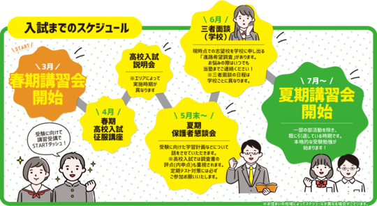 各県の高校入試の入試制度の仕組みや出題傾向などについて、資料のご提供とともにご説明をさせていただきます。また、受験に向けた当塾の取り組みと年間スケジュールについてもご案内いたします。
