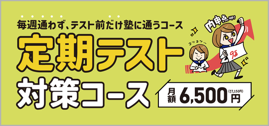 one塾の定期テスト対策コースは、中学校の定期テスト前に短期集中で通える対策専用コースです。毎週通塾するコースではなく、テスト前の一定期間だけ通うスタイル。「今回はしっかり点数を上げたい」「まずは試してみたい」というご家庭にもご利用いただきやすいコースです。月額7,150円(税込)で受講できるため、継続コースよりも気軽に始められるのも特長です。