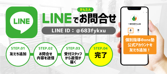 個別指導のone塾ではLINEからも無料体験のご予約やお問合せ、ご質問・ご相談等が可能です。