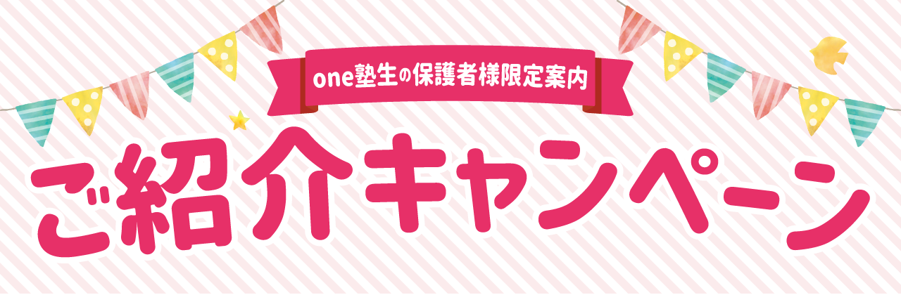 お子様をお持ちのお知り合いの方へ是非one塾の「のびのびコース(小学生のみ)」「スーパー飛び級®(幼児・小学生)」をご紹介ください。日頃からお世話になっている保護者様からのご紹介の方は優先してご案内させていただきます。