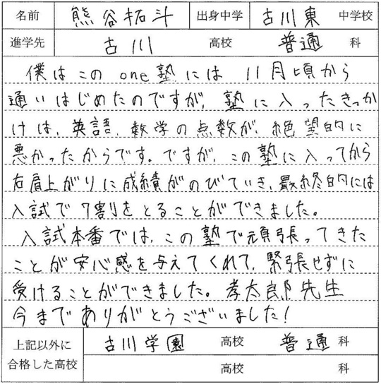 「個別指導のone塾 古川校」の校舎長をしております、尾形 孝太郎と申します。