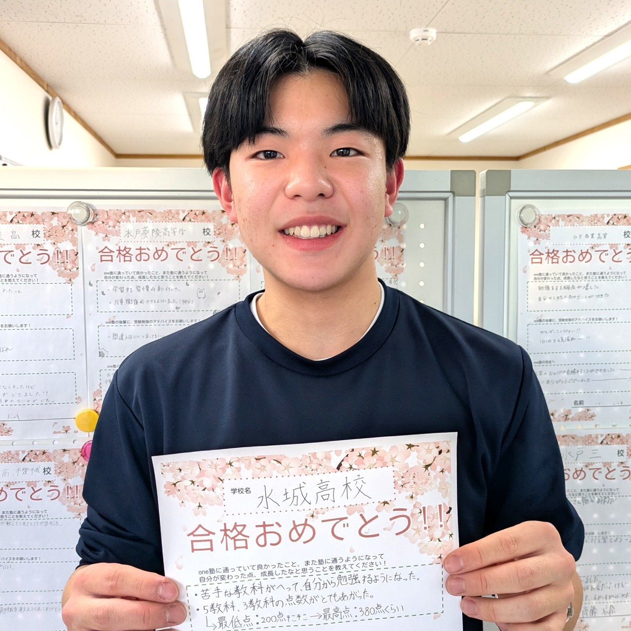 最初に受けたテストでの判定はE判定で、とても志望校に受かるとは思いませんでした。だけど塾に通ってから、先生も丁寧に教えてくれて、とても楽しく、コツコツ勉強している間にA判定になり、合格までもってこられました。ありがとうございました!