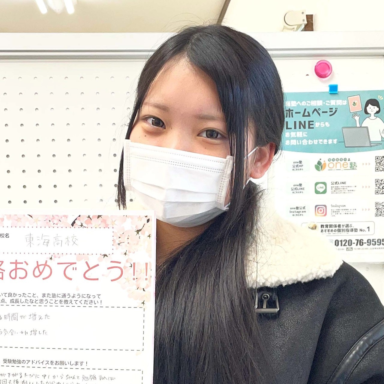 分からないことや悩んでいること、たくさん話を聞いてくださりありがとうございました。入試当日、緊張でやられた私は先生の「大丈夫!」を思い出し、試験を受けることができました。one塾に通ってよかったです。本当にありがとうございました!
