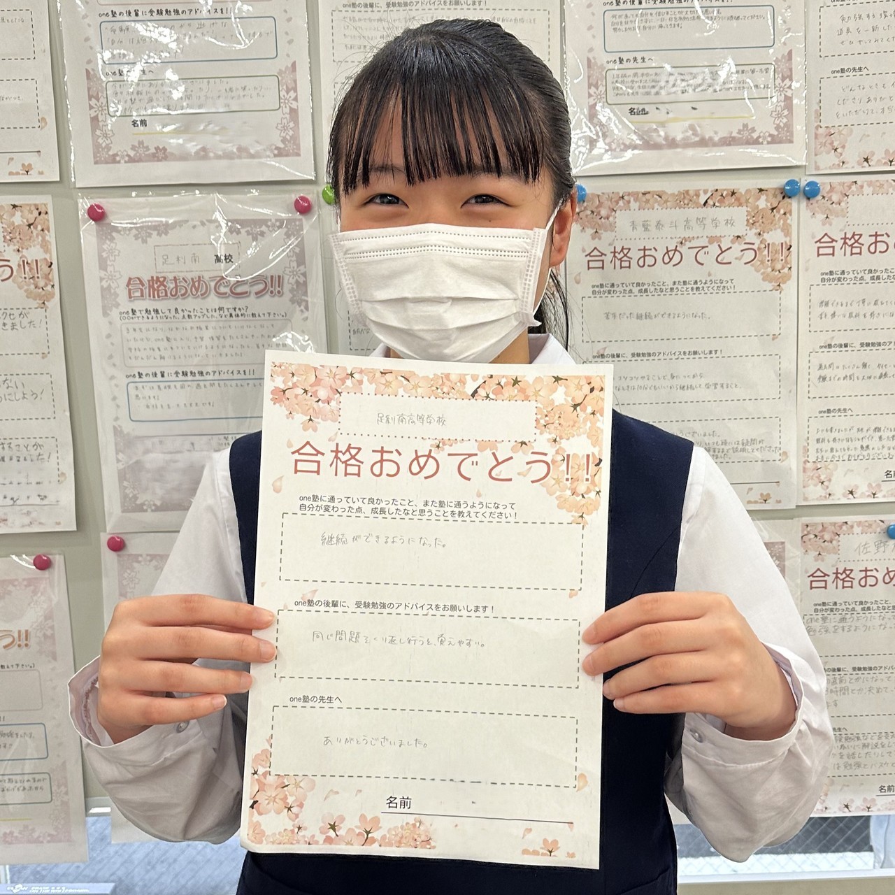 受験まであと半年というときにone塾に入り、先生方の丁寧な指導をしていただいたおかげで志望校に合格することができました。本当にありがとうございました。