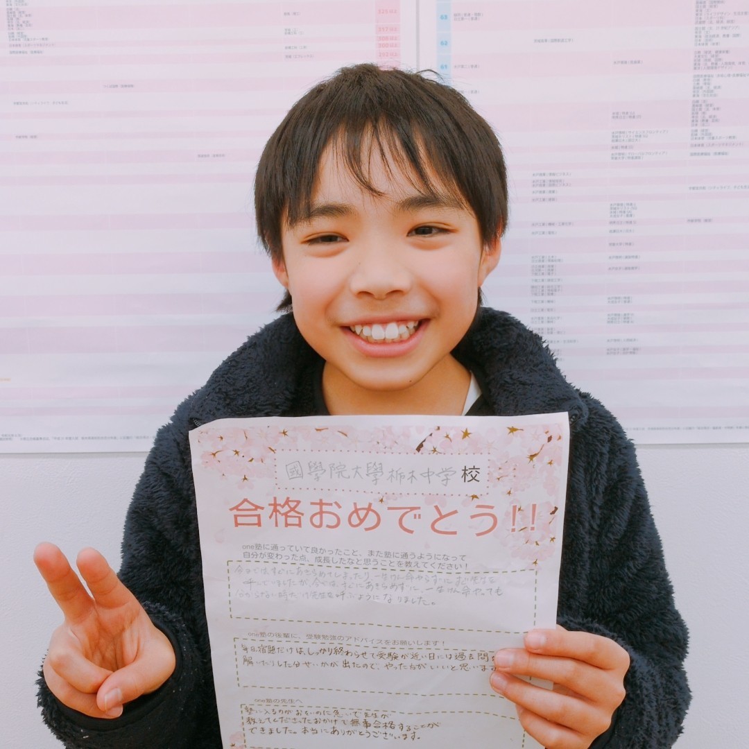 (one塾に在籍中、)栃女に入学して大学に進学できました。one塾に通っているうちに勉強への意識、意欲が変わり、目標、計画をスムーズに立てられるようになりました。勉強に苦手意識が強かったのですが、先生のご指導のもと、成績が上がり、これ以上ない達成感を味わうことができました。