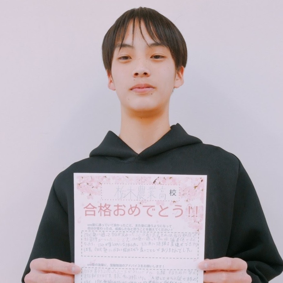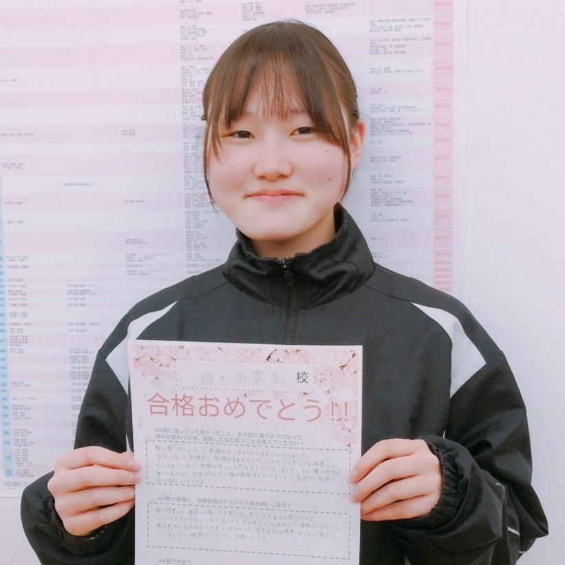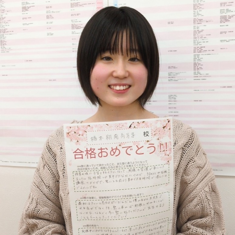 one塾に入ってから、先生に分からないところを詳しく教えてもらったり、自分に合った参考書などを見つけ、学力を上げることができました。