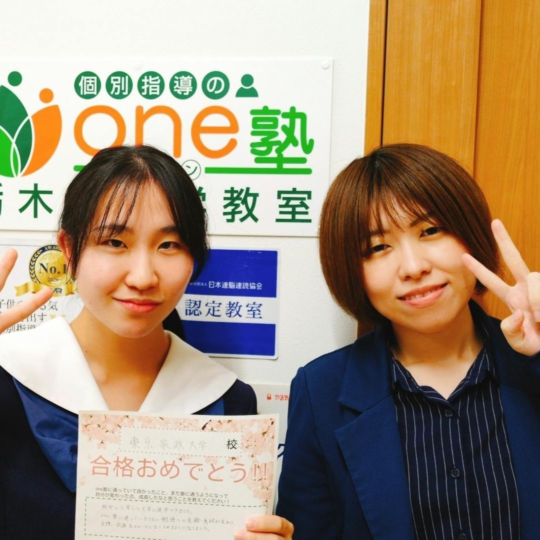 (one塾に在籍中、)栃女に入学して大学に進学できました。one塾に通っているうちに勉強への意識、意欲が変わり、目標、計画をスムーズに立てられるようになりました。勉強に苦手意識が強かったのですが、先生のご指導のもと、成績が上がり、これ以上ない達成感を味わうことができました。