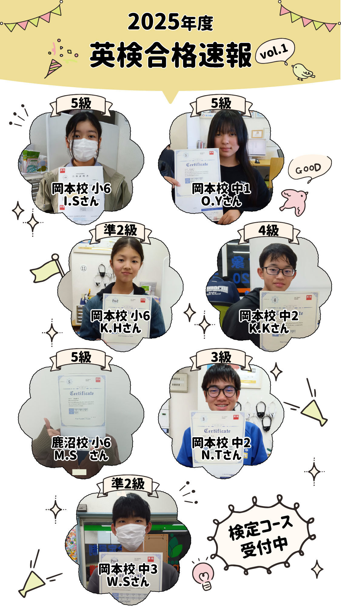 検定試験にあたって準備をする中で、勉強に対する意識が上がります。得意科目は上の学年の級に合格して自信をつけたり、苦手科目は下の学年の級に合格して成功体験を得たりすることは、お子様の意欲を高め、勉強だけではない様々なことに挑戦する自己肯定感を高めます。