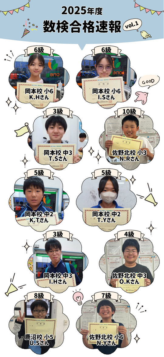 検定試験にあたって準備をする中で、勉強に対する意識が上がります。得意科目は上の学年の級に合格して自信をつけたり、苦手科目は下の学年の級に合格して成功体験を得たりすることは、お子様の意欲を高め、勉強だけではない様々なことに挑戦する自己肯定感を高めます。
